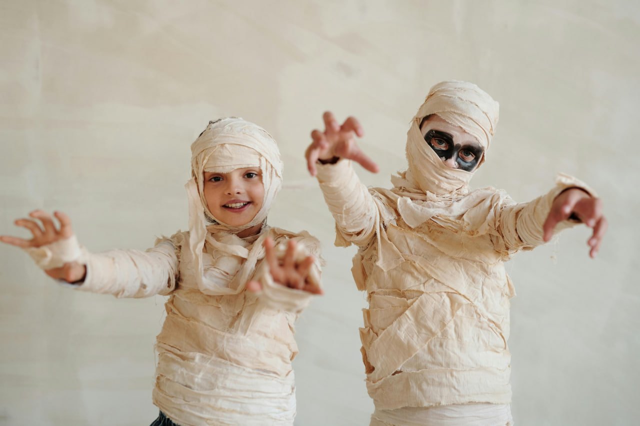 Для створення костюма мумії візьміть старі білі простирадла або медичні бинти та порізайте їх на довгі смуги шириною близько 5-10 сантиметрів. Обмотайте ними все тіло поверх базового білого або бежевого одягу, залишаючи прорізи для очей і рота. Для більшої реалістичності попередньо замочіть тканину в слабкому розчині чаю або кави — це надасть бинтам ефект старовини та забрудненості. Можна також додати штучну кров або темно-коричневу фарбу в окремих місцях. Завершіть образ відповідним макіяжем обличчя з використанням світлих тонів та темних акцентів навколо очей, щоб створити ефект глибоких очних ям.