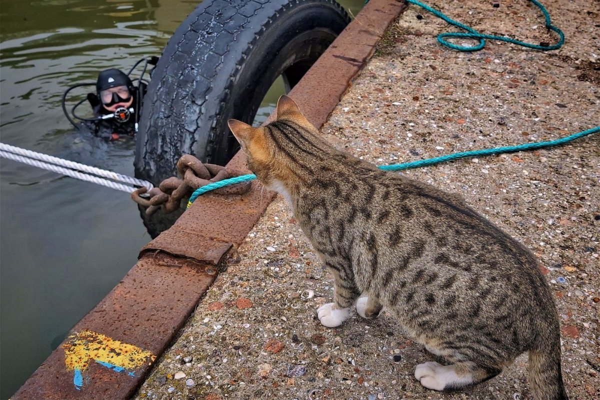 Барсик навіть супроводжує водолазів перед зануренням — ніби перевіряє, чи все готово до роботи. За словами військових, кіт давно став більше, ніж просто улюбленцем.