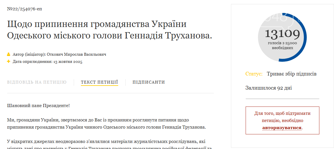 На офіційному сайті Президента України з’явилася електронна петиція під назвою "Щодо припинення громадянства України Одеського міського голови Геннадія Труханова". Автори звернення просять главу держави розглянути питання про позбавлення чинного мера Одеси українського громадянства, посилаючись на інформацію про наявність у нього паспорта громадянина Російської Федерації. Ці факти, на їхню думку, суперечать Конституції України, яка закріплює принцип єдиного громадянства, та створюють значні ризики для національної безпеки в умовах повномасштабної війни.