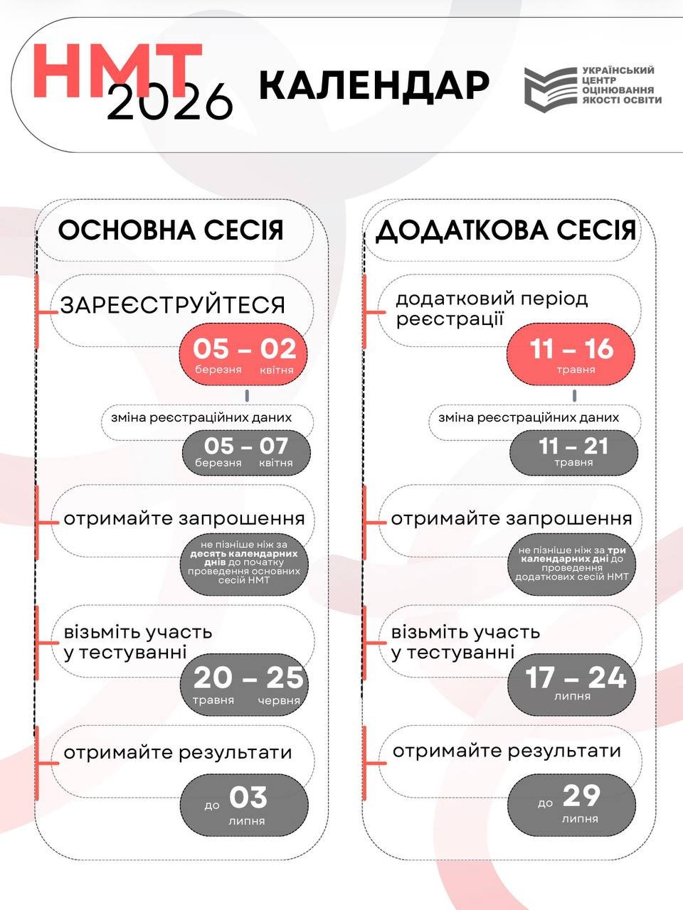 Український центр оцінювання якості освіти повідомив, що основні сесії НМТ-2026 відбудуться з 20 травня по 25 червня, а додаткові — 17–24 липня. Реєстрація проходитиме в онлайн-форматі, а скласти тест можна буде як в Україні, так і за кордоном.