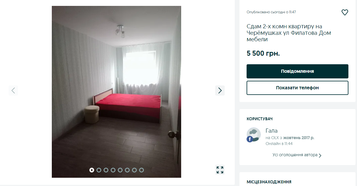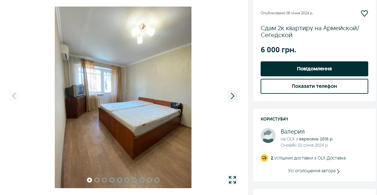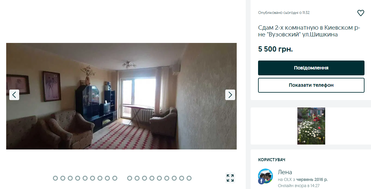 «Здам на тривалий термін. Газовий будинок. Косметичний ремонт. Кімнати з роздільними ходами. Балкон засклений. Меблі в хорошому стані. Двоспальне ліжко, диван, шафи, вбудована кухня, побутова техніка, бойлер, кондиціонер, пральна машина, варильна газова поверхня, мікрохвильова піч. Є інтернет. На будинок стоїть лічильник на тепло. Комунальні мінімальні. Якщо не буде світла, то тепло і холодна вода є. Хороша транспортна розв'язка, супермаркети, ринок, дитячі садки, школи. Без тварин», — зазначила авторка оголошення.