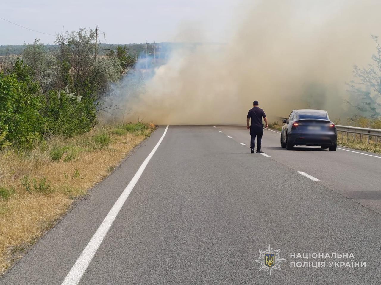 В поліції розповіли, що на місці події працює група реагування, яка здійснює регулювання дорожнього руху однією смугою. З вогнем борються співробітники Державної служби з надзвичайних ситуацій.
