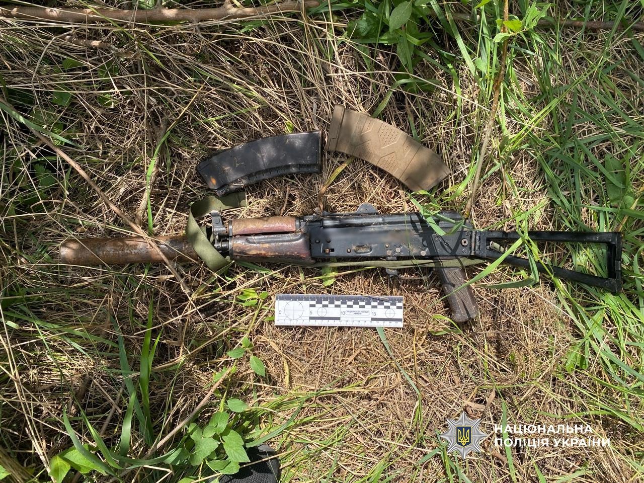 Під час огляду території домогосподарства правоохоронці виявили придатний для використання автомат Калашникова, який був захований у кущах позаду літньої кухні. Зброя, за висновком експерта, є нарізною вогнепальною та становить реальну загрозу.