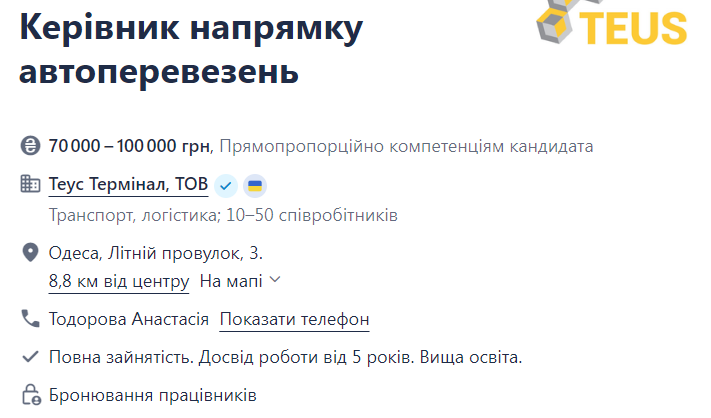 - основне завдання посади — побудова роботи напрямку авто-логістики;