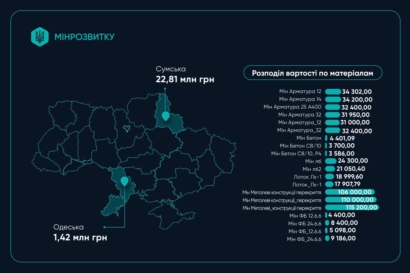 "Упродовж останнього тижня до дашборду внесено актуальні дані щодо закупівель, здійснених підрядними організаціями в Одеській та Сумській областях. Зокрема, до переліку закуплених матеріалів увійшли фортифікаційні блоки, металоконструкції, арматура та бетон", — зазначають у повідомленні.