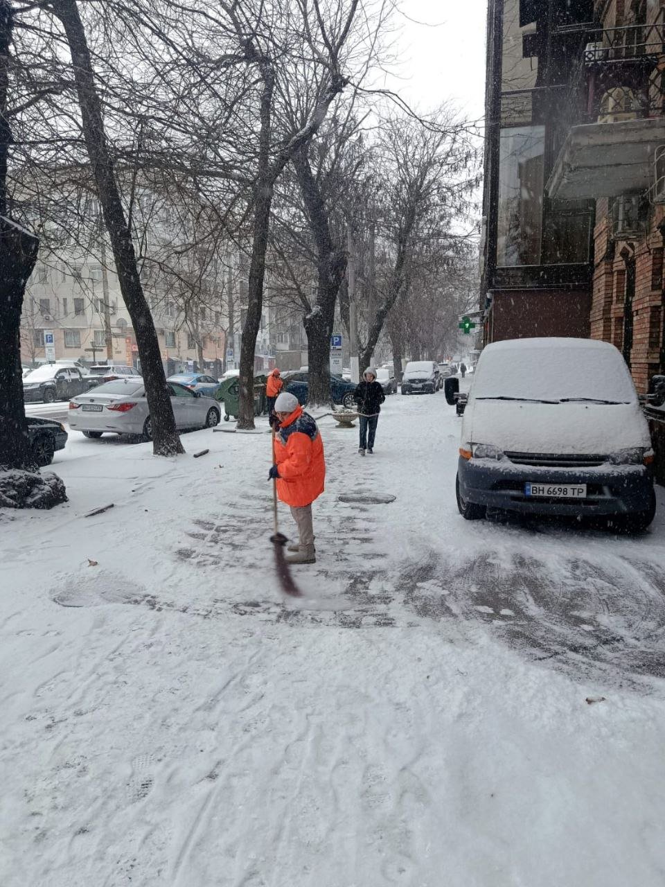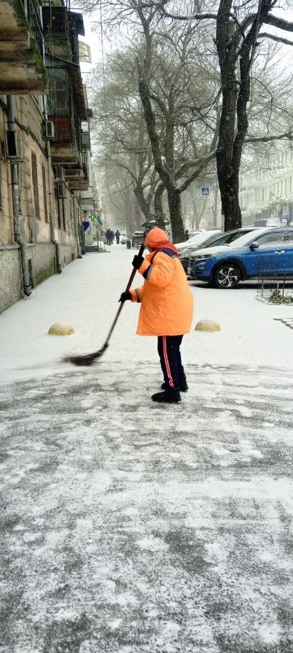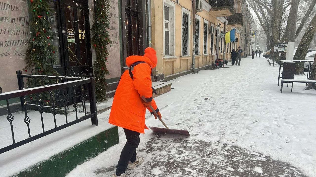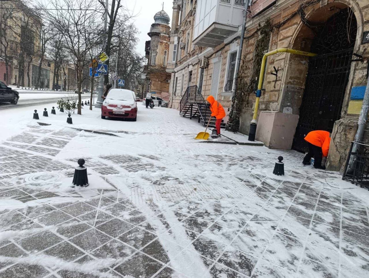 На оприлюднених світлинах — центральні вулиці Одеси, пішохідні зони, двори історичної забудови та прикрашені до свят локації. Комунальники працюють на тротуарах і проїжджій частині, розчищаючи сніг та обробляючи покриття проти ожеледиці.