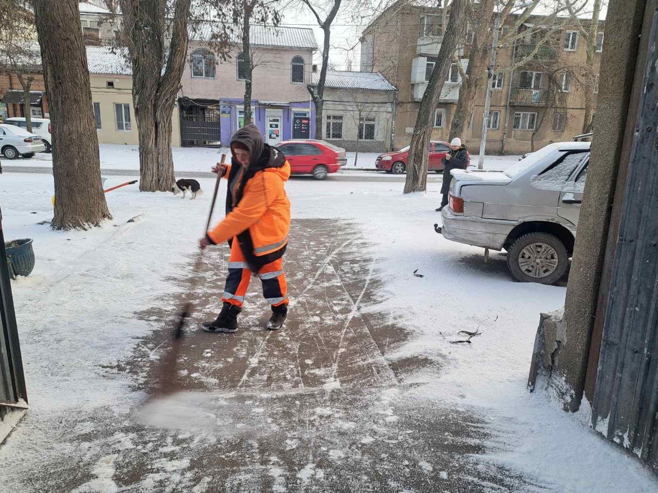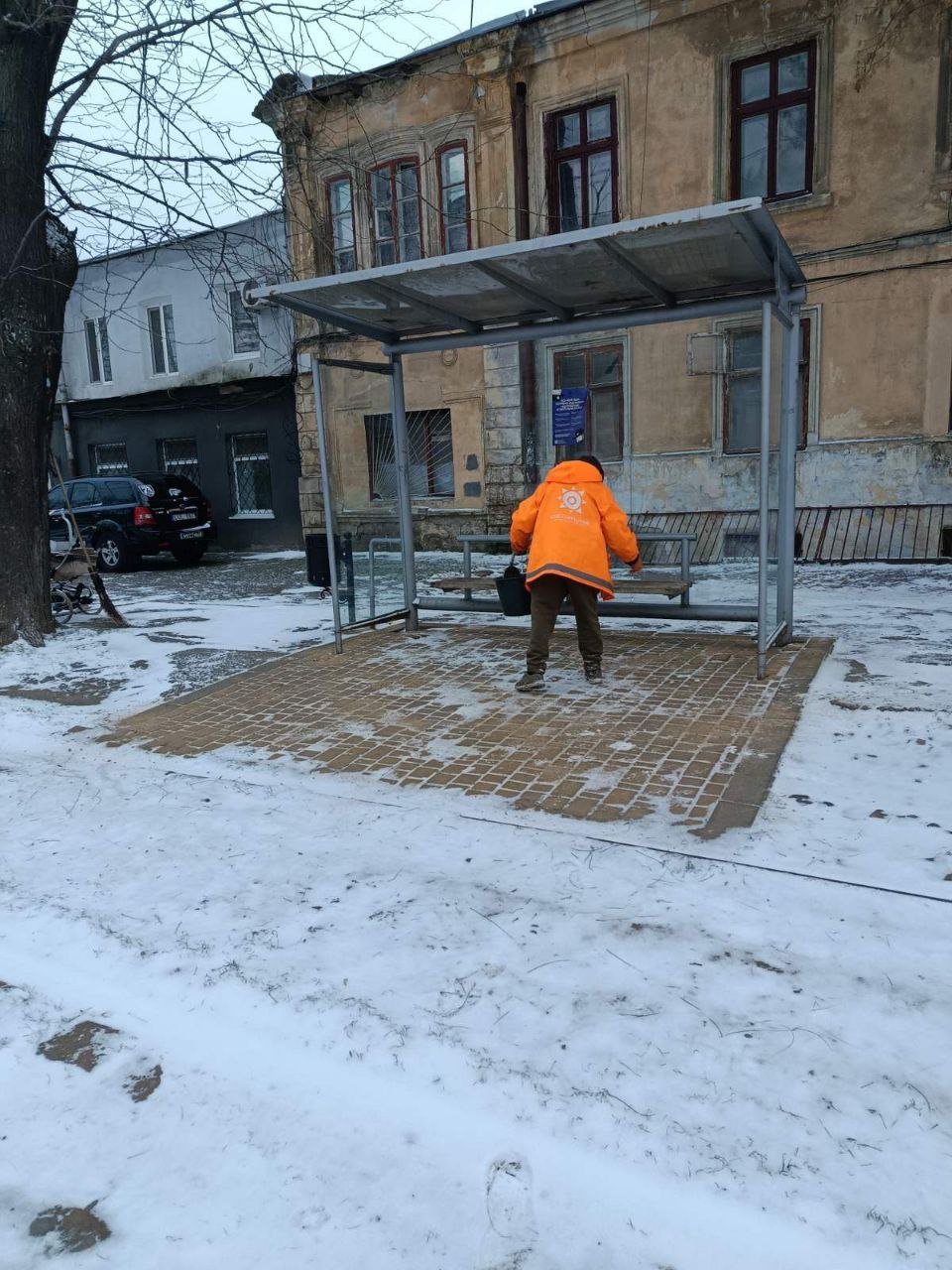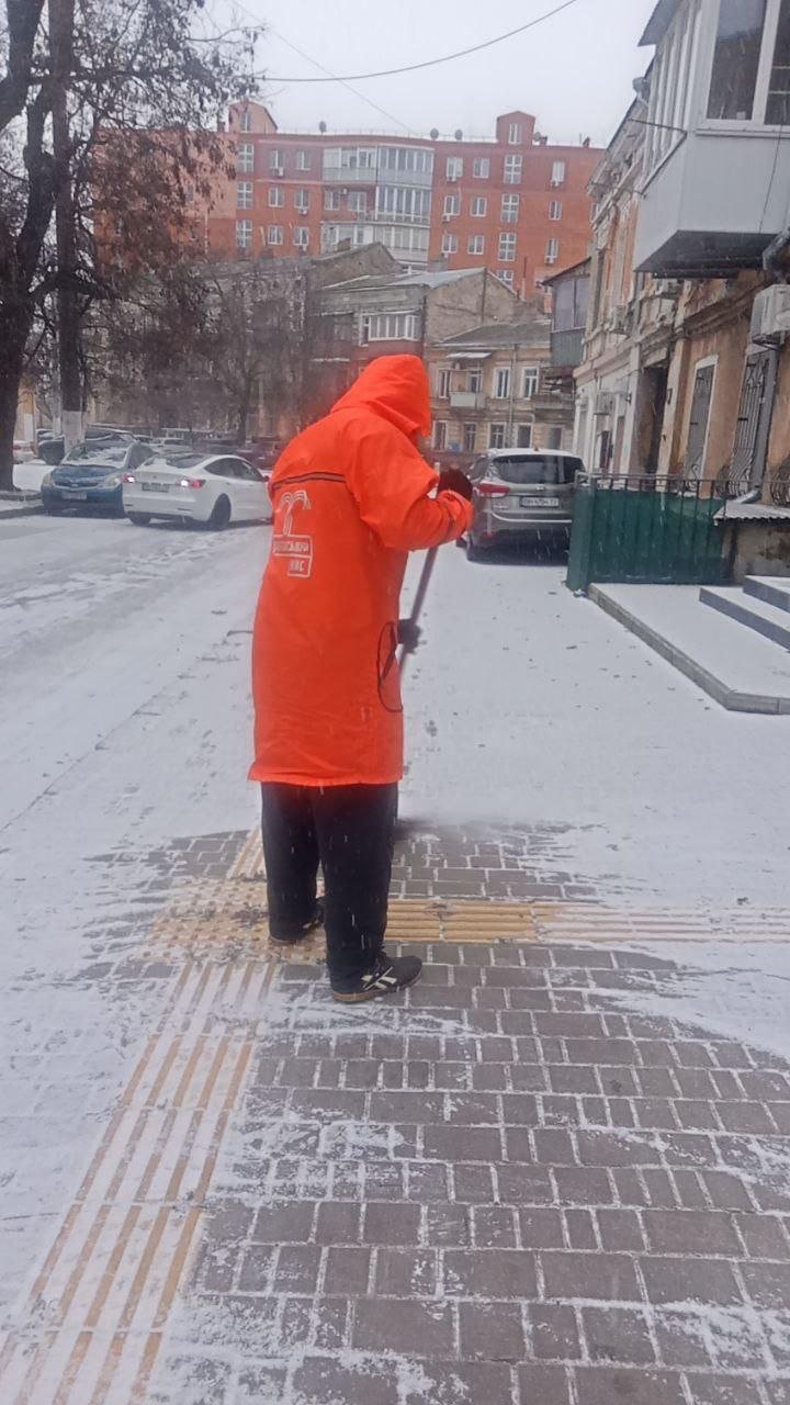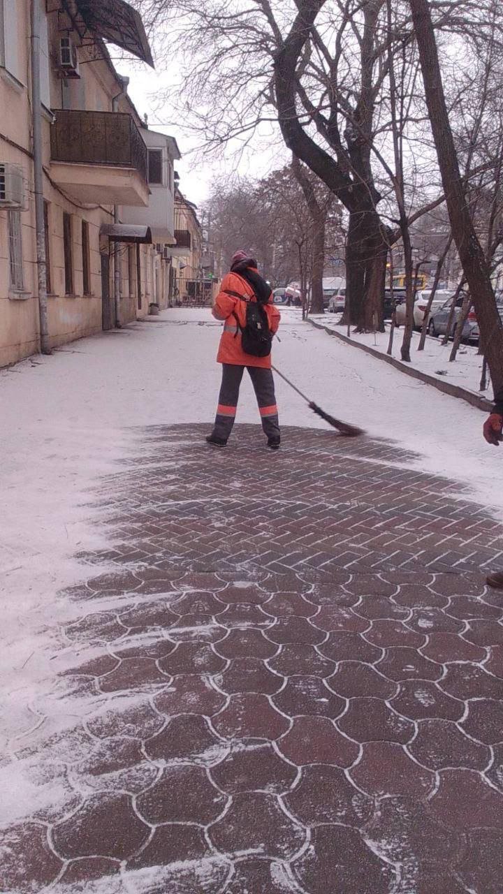 На оприлюднених світлинах — центральні вулиці Одеси, пішохідні зони, двори історичної забудови та прикрашені до свят локації. Комунальники працюють на тротуарах і проїжджій частині, розчищаючи сніг та обробляючи покриття проти ожеледиці.