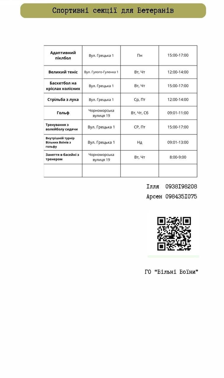 "Розклад роботи спортивних секцій для ветеранів. Щодо консультацій з адаптивних видів спорту звертайтесь за вказаними телефонами або до Департаменту у справах ветеранів та Хаб Ветеран", — йдеться у повідомленні.