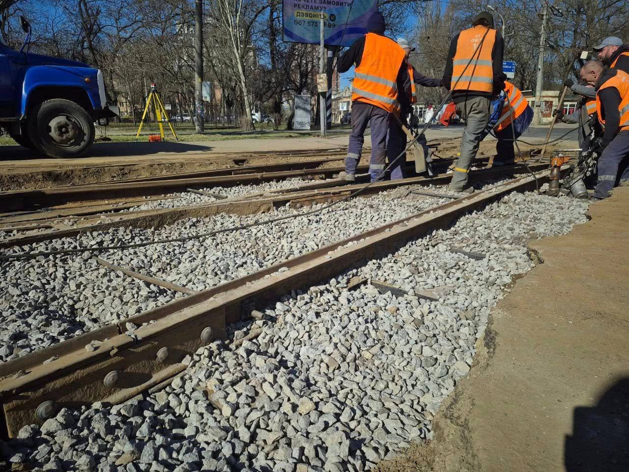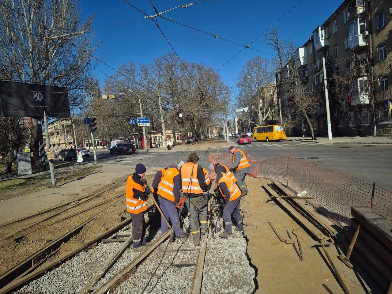 "Поки електротранспорт вимушено простоює через нестачу електропотужностей бригада служби ремонту колії та споруд КП «Одесміськелектротранс» проводить ремонтні роботи колій", — повідомляє Одеська міська рада 10 березня.