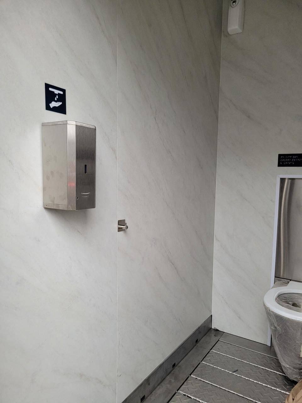 Як зазначається, вбиральня оснащена автоматичними системами вентиляції та підігріву повітря, а також – миття, дезінфекції та сушіння сидіння унітазу і підлоги після кожного відвідувача.