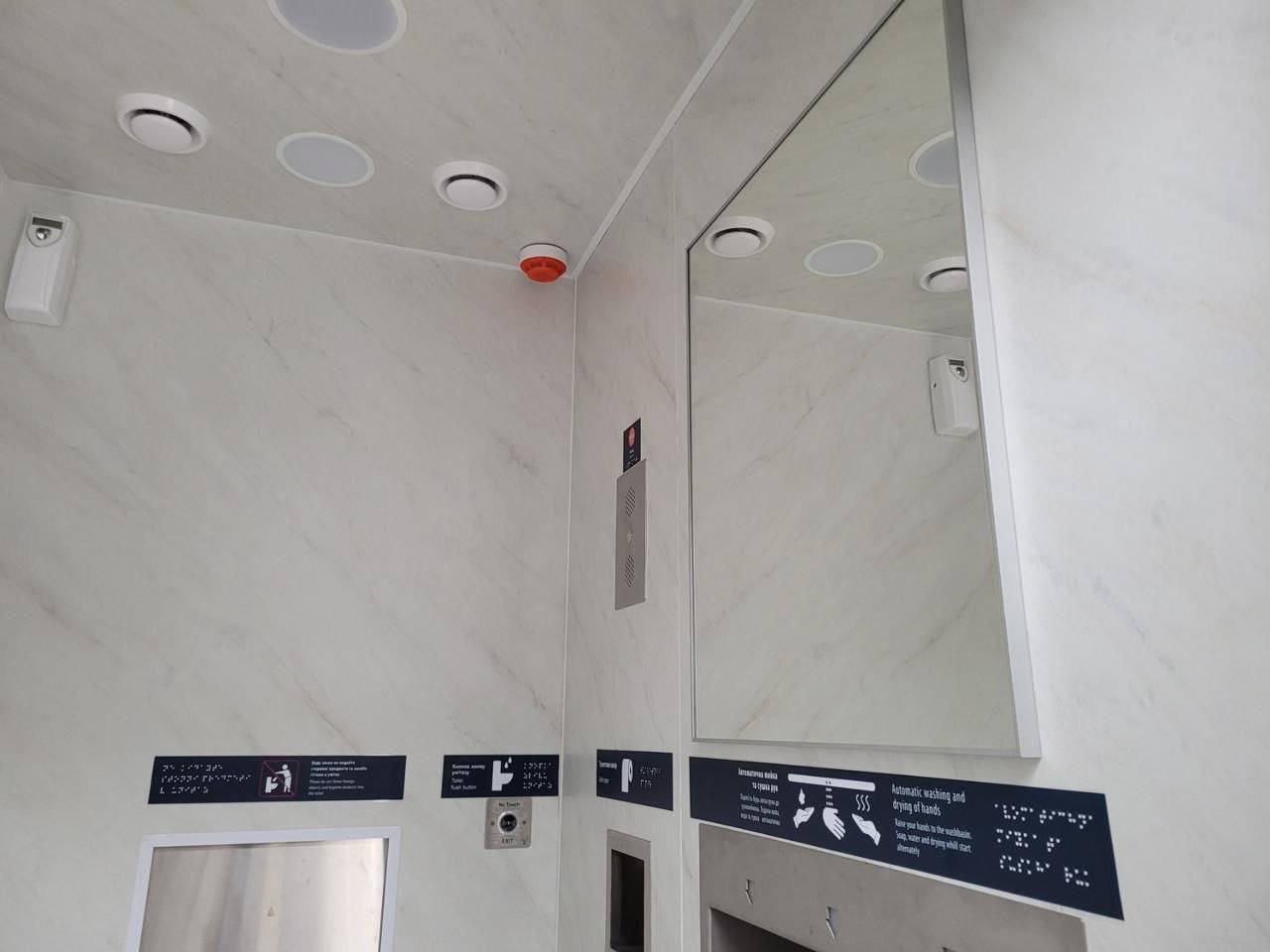 Також передбачені безконтактні системи подачі води й мила, автоматична сушарка для рук, санітайзери та диспенсери.