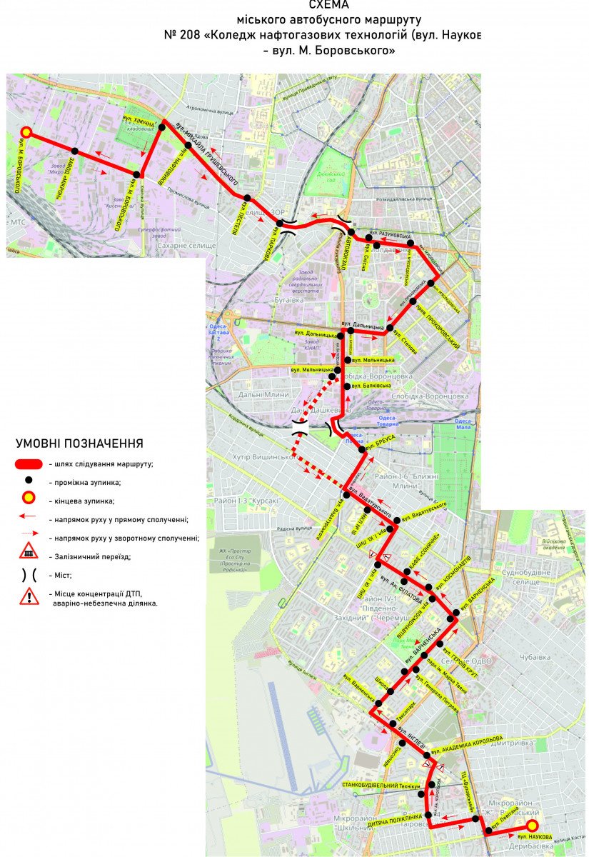 З 26 жовтня 2024 року будуть внесені зміни до схеми руху міського автобусного маршруту загального користування № 208 «Коледж нафтогазових технологій (вул. Наукова) — вул. М. Боровського», організувавши рух автобусів: