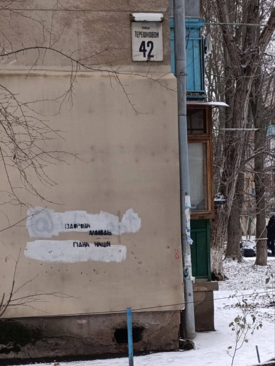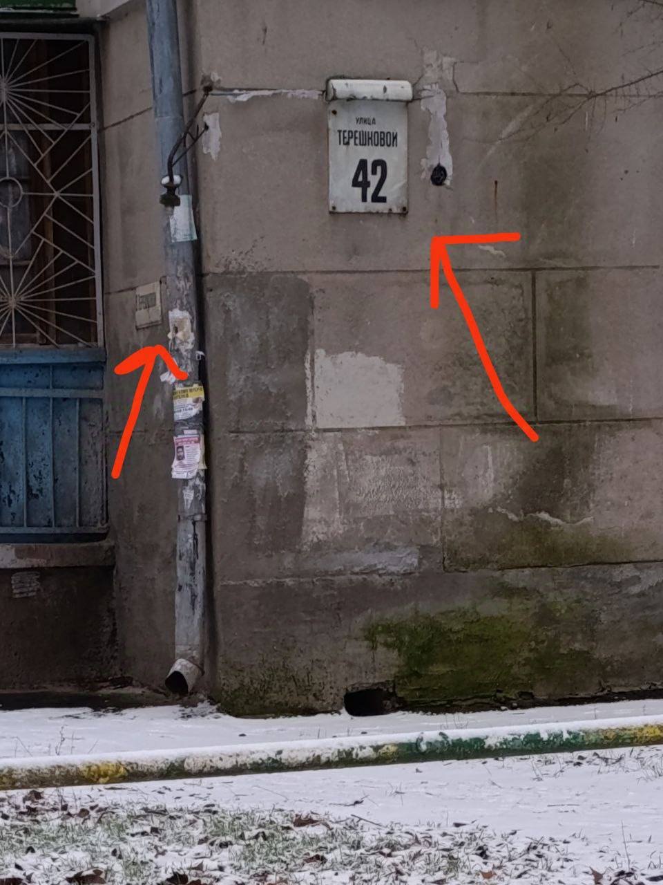 Про це повідомили громадські активісти, оприлюднивши фото з різних будинків, на яких залишилися покажчики з прізвищем Валентини Терешкової. Таблички з радянською та проросійською назвою зафіксували одразу за кількома адресами, зокрема на будинках №38, 42, 44, 45 та 52.