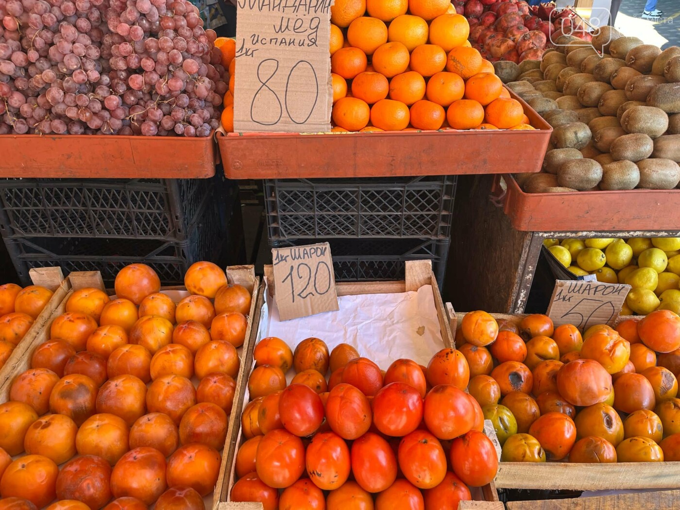 Щодо фруктів, то на Привозі їх побільшало, особливо цитрусових. Апельсини та мандарини продаються за 80-100 гривень, банани — за 70 грн, помело — за 80 грн, а лимони — за 90 грн. З'явилася й хурма різних сортів. В середньому за неї хочуть 100 гривень.