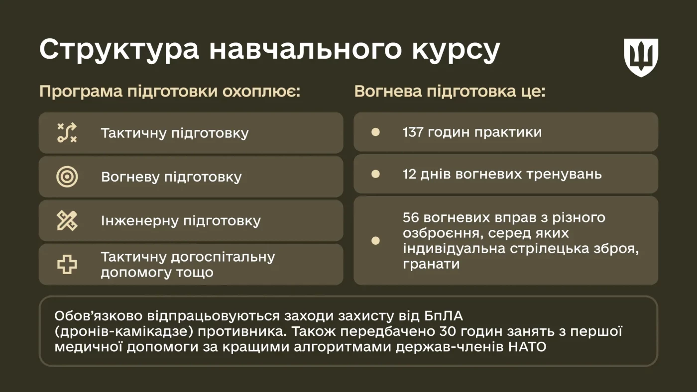 Варто відзначити рівень вогневої підготовки – це 137 годин практики та 56 вогневих вправ з різного озброєння. Також обов’язково відпрацьовуються заходи захисту від БпЛА (дронів-камікадзе) противника. За результатами успішного навчання військовослужбовці отримують сертифікат та класну кваліфікацію за військово-обліковою спеціальністю №100 «Стрілець».