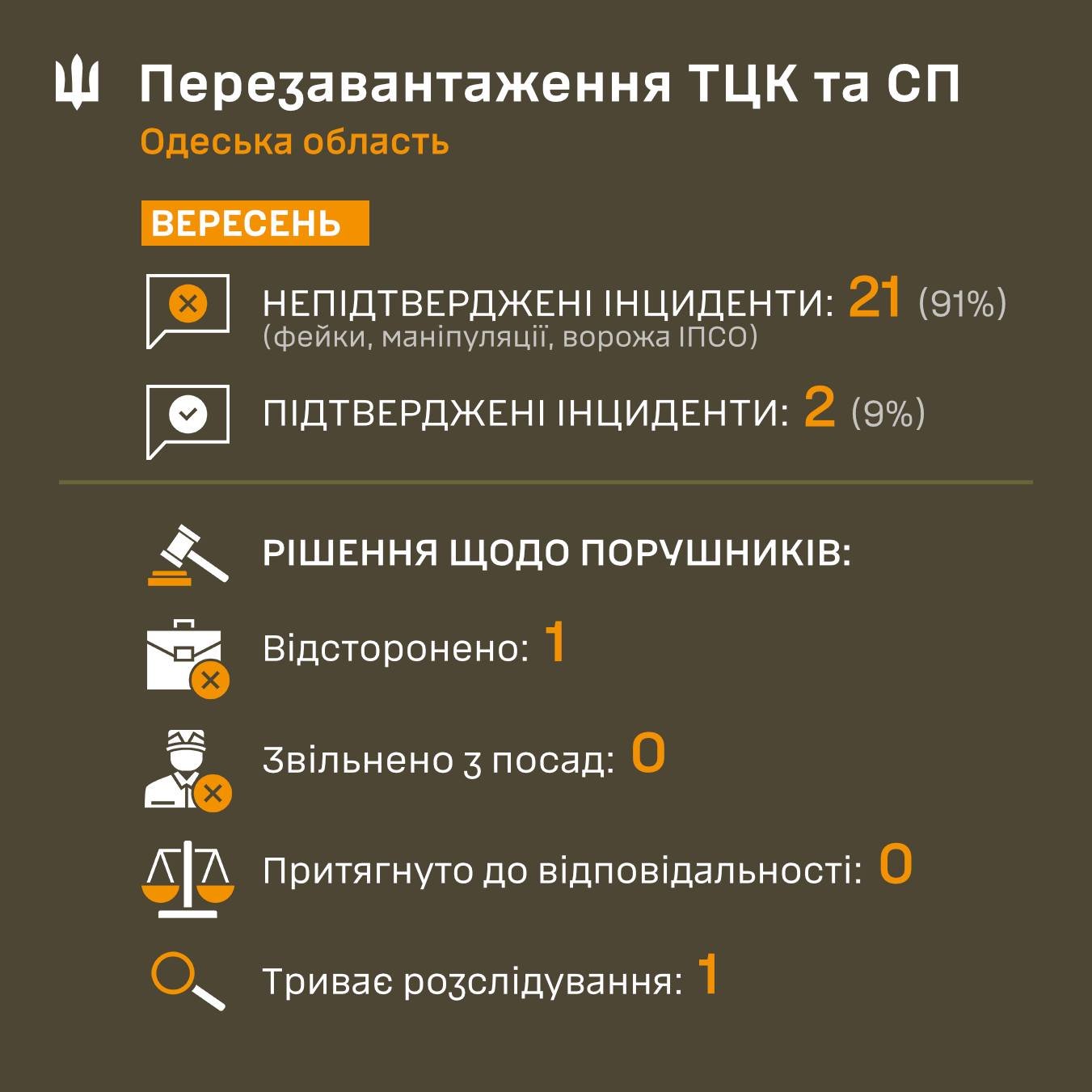 За даними Одеського обласного ТЦК в Одеській області за вересень зафіксували 21 інцидент. Більшість випадків не підтвердилась.