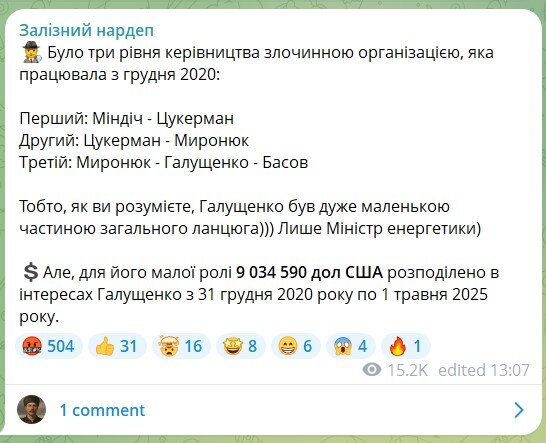 "То есть, как вы понимаете, Галущенко был очень маленькой частью общей цепи. Только Министр энергетики", — иронично отметил в своем отчете нардеп Ярослав Железняк.